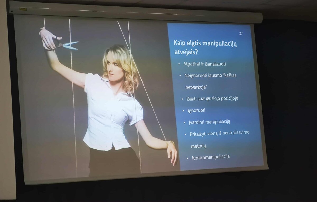 Šią savaitę įvyko seminaras „Psichologinio smurto (mobingo) atpažinimas ir valdymas“, kurį vedė lektorius Juris Belte. Seminaro metu buvo kalbama apie atsakomybės ribas, įsižeidimą, mentalinės sveikatos svarbą, konstruktyvų bendravimą ir manipuliacijų atpažinimą. Aptarėme, kaip reaguoti į kritiką, kaip ją išsakyti, kokių žodžių geriau vengti, o kokie padeda išlaikyti pagarbų dialogą. Buvo pristatytas Karpmano trikampio modelis, pasvarstyta, kaip elgtis situacijose, kuriose manipuliuojama ir kaip įvardyti jausmus, kai jaučiamės, kad manipuliuojama mumis.