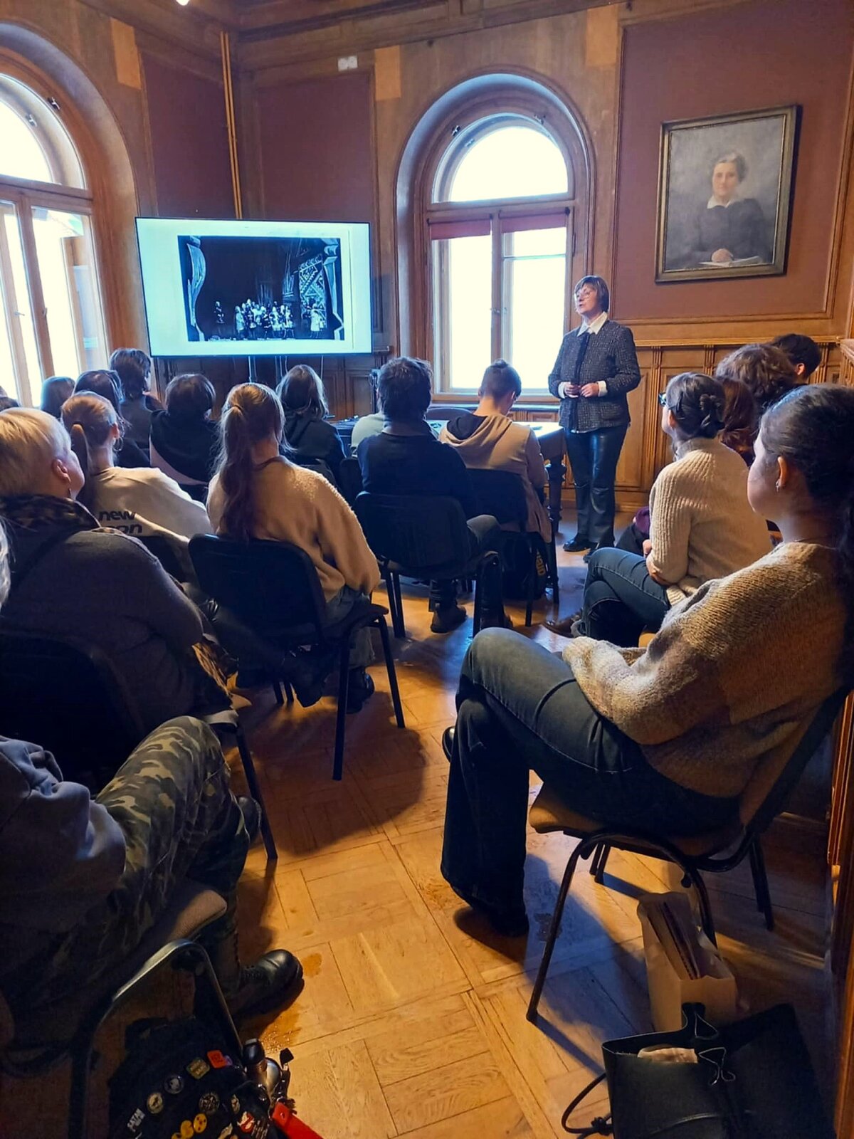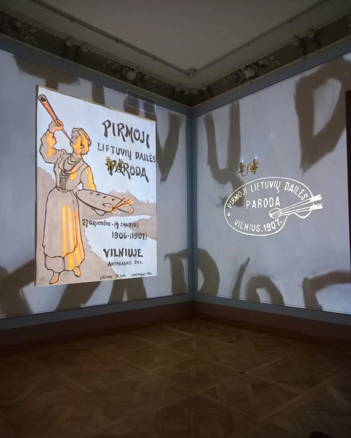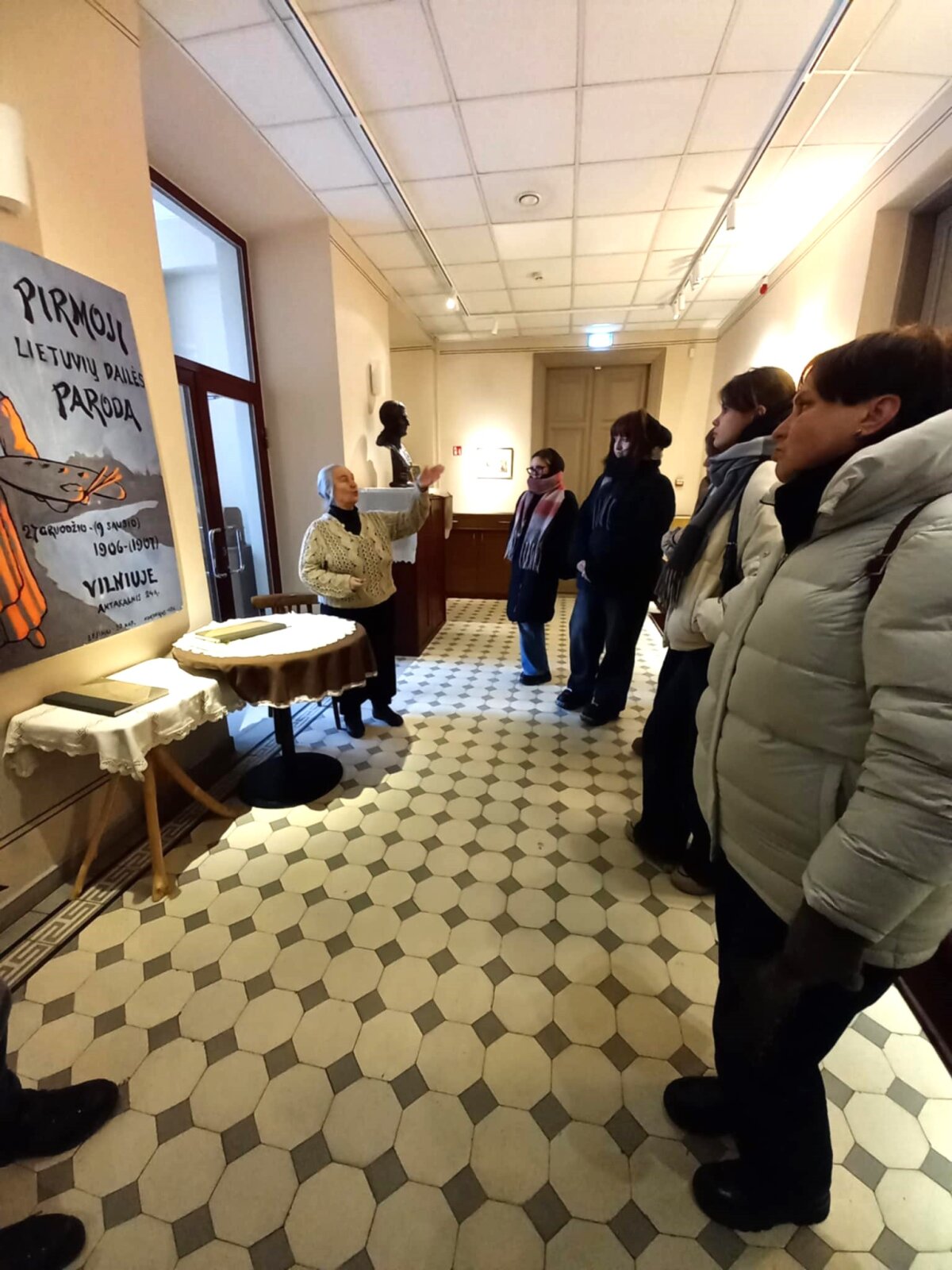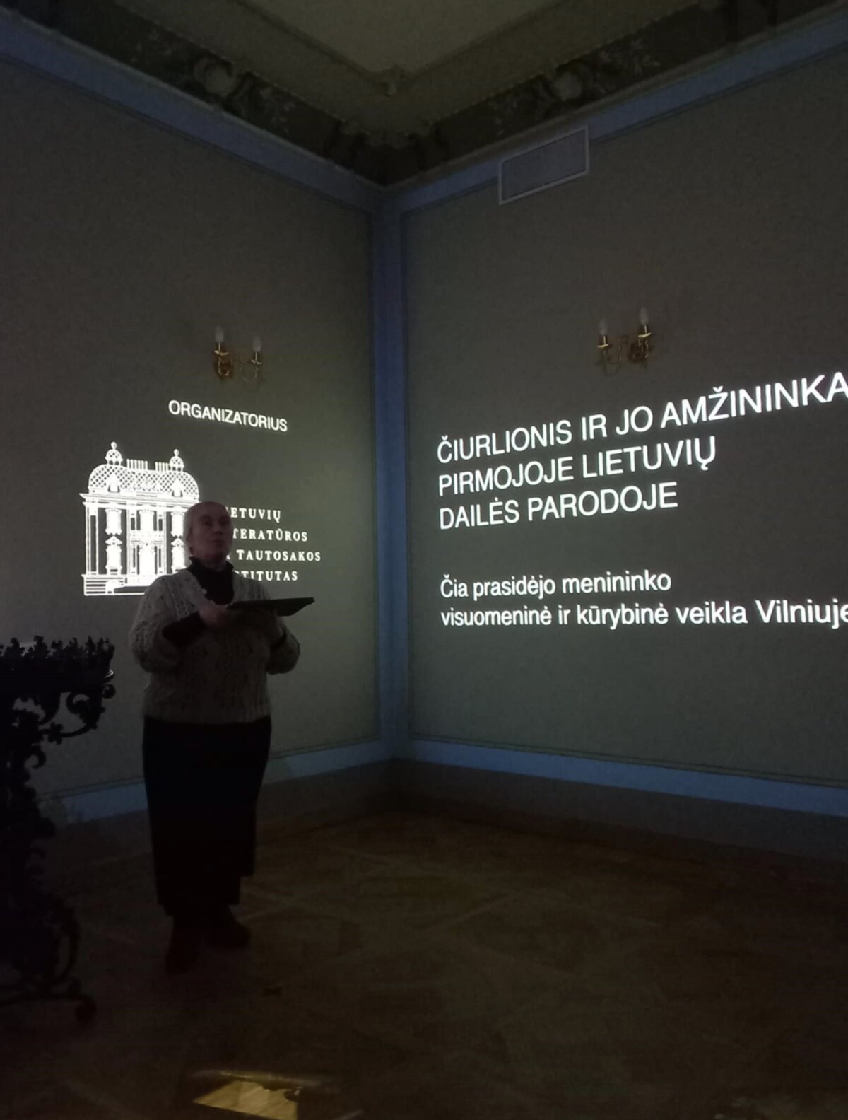 Po paskaitos turėjome galimybę apžiūrėti Lietuvių literatūros ir tautosakos instituto parengtą parodą „Čiurlionis ir jo amžininkai Pirmojoje lietuvių dailės parodoje“. Parodą pristatė etnologė Gražina Kadžytė. Būtent čia, buvusiuose P. Vileišio rūmuose, 1907 m. sausio 9 d. (1906 m. gruodžio 27 d. senuoju stiliumi) Lietuvos visuomenė pirmąkart išvydo M. K. Čiurlionio tapybos ir grafikos kompozicijas. Įdomūs techniniai parodos sprendimai, ant trijų menės sienų rodomos paveikslų projekcijos, kiti dokumentai, straipsniai, nuotraukos, visa tai lydima parodos rengėjų pašnekesio, paliko įspūdį mokiniams ir mokytojoms. Atsidūrėme tarsi autentiškoje erdvėje, kur projekcijos nukeldavo mus iš vieno ekspozicijos kambario į kitą. Sužinojome, kas dalyvavo parodos atidaryme, iš kur buvo atvežti eksponatai, kas lankėsi parodoje, kiek kainavo bilietai, kur spausdinti katalogai ir afišos ir t.t.