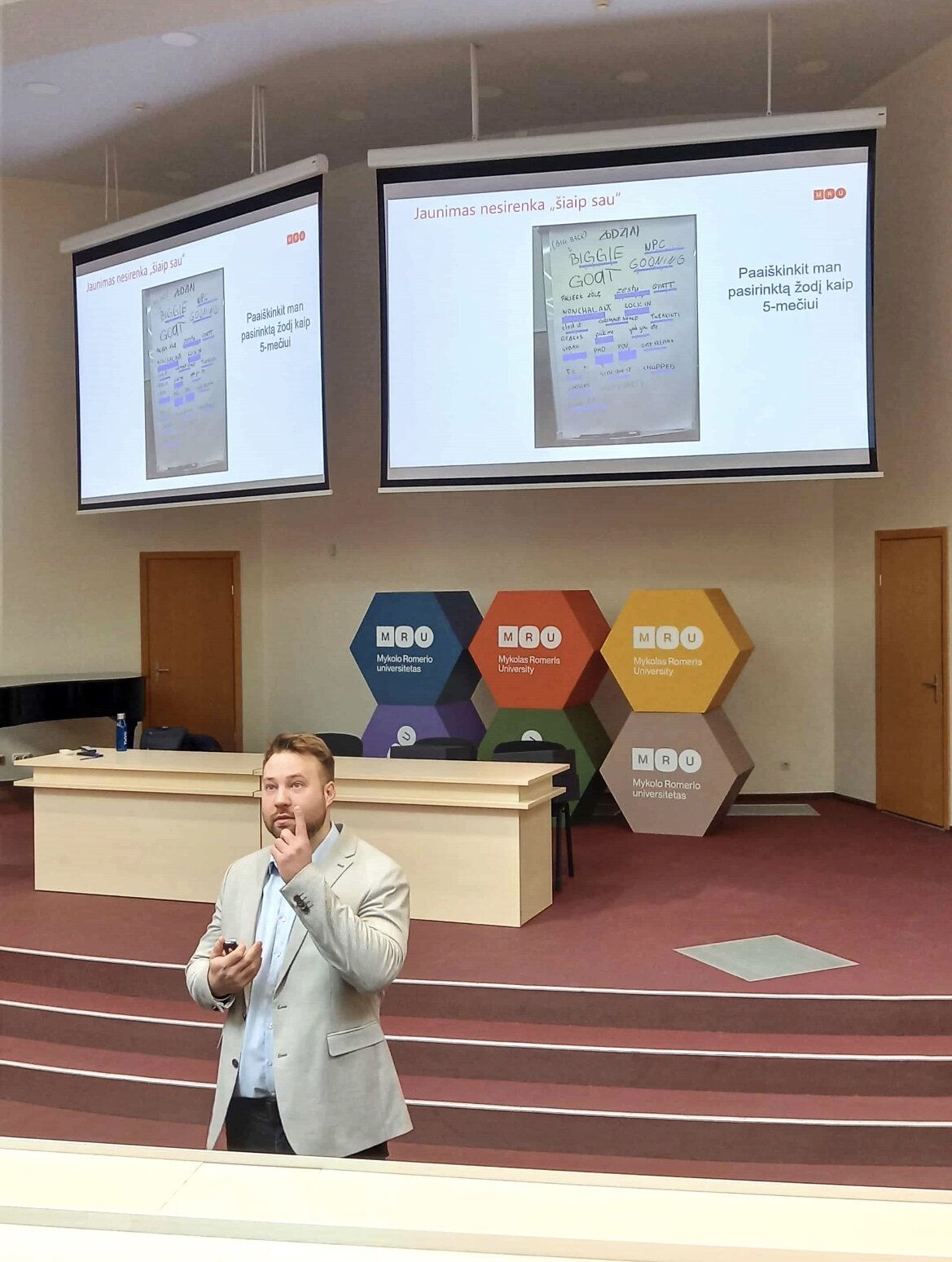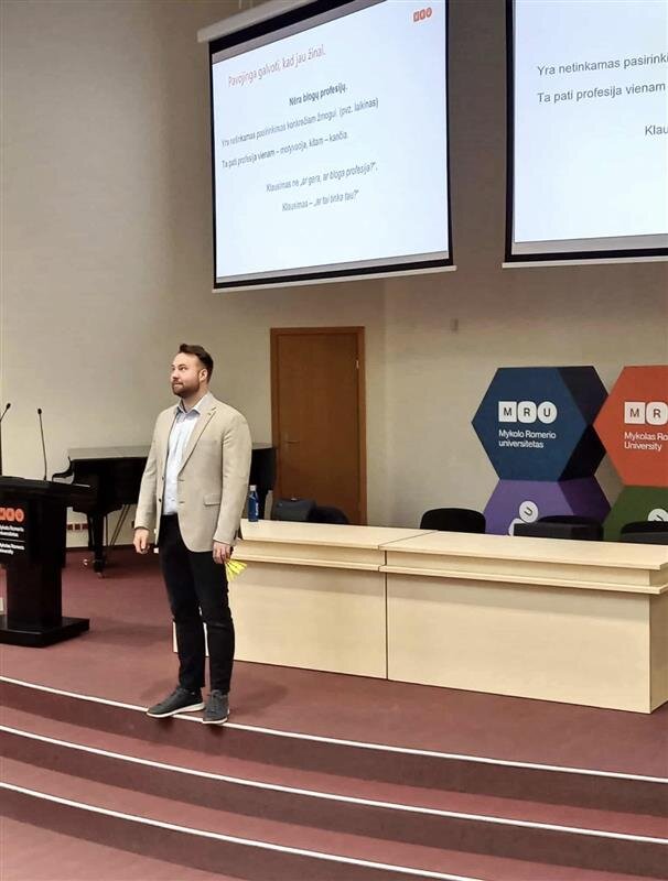 Paskaitą vedė dr. Justinas Staliūnas, kuris nuolat įtraukdavo mokinius į diskusiją apie tai, kas lemia mūsų būsimos profesijos pasirinkimą ir kokius žingsnius reikėtų padaryti dabar. Visų pirma pasirinkti reikiamus dalykus 10 klasėje, vėliau reikiamus egzaminus 12 klasėje, po to tinkamą studijų kryptį bei universitetą. Dėstytojas akcentavo, kad dažniausiai mes nepasirenkame vieno darbo visam gyvenimui, o pasirenkame sritį, kaip ir kur gebėsime keistis ir tobulėti. Tai ypač svarbu sparčiai vystantis technologijoms ir skaitmenizacijai, nes kai kurios profesijos gali išnykti, kitos keičiasi, taip pat atsiranda naujos profesijos, kurių dar visai neseniai nebuvo. Lektorius pabrėžė, kad nėra blogų profesijų, yra netinkamas pasirinkimas konkrečiam žmogui. Ta pati profesija vienam – motyvacija, kitam – kančia. Reikia visada užduoti sau klausimą : ,,Ar tai tinka man?“.