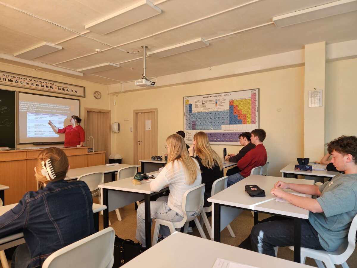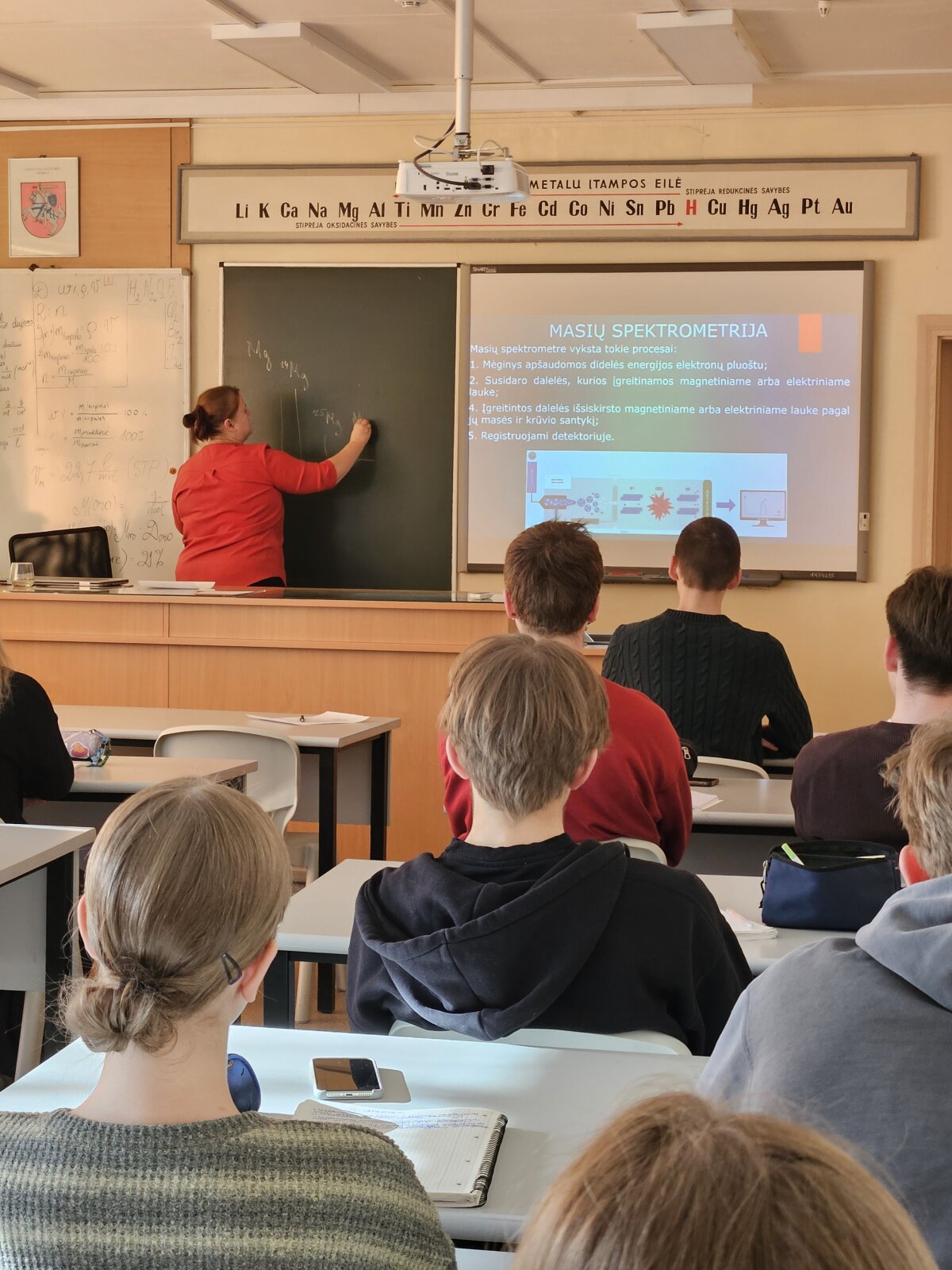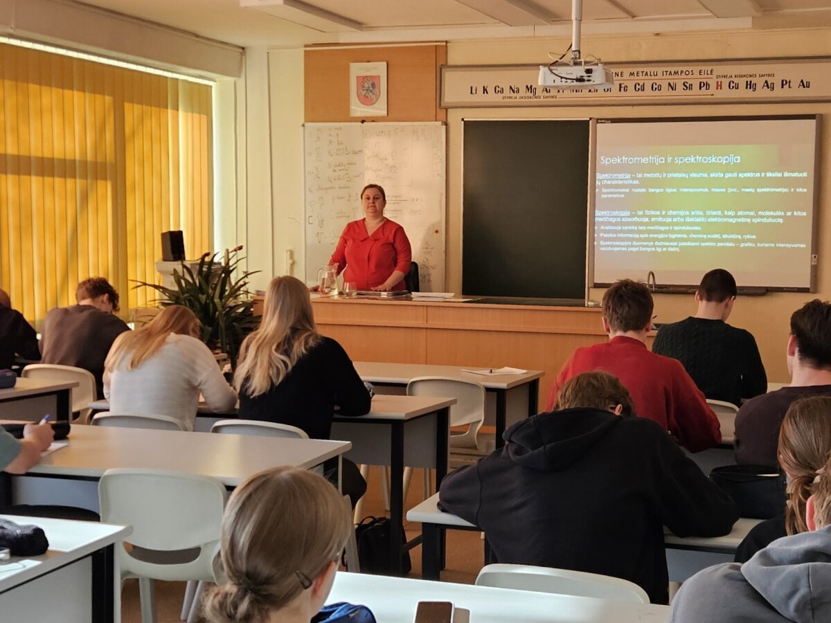 Balandžio 22 d. mūsų gimnazijoje III klasių mokiniams, besimokantiems chemiją ir besiruošiantiems laikyti chemijos VBE I dalį, vyko Vilniaus univesriteto dėstytojos Sigitos Višniakovos pamoka - paskaita ,,Šiuolaikinių medžiagų tyrimo metodai. Spektriniai analizės metodai". Dėstytoja puikiai išaiškino teorinę medžiagą.