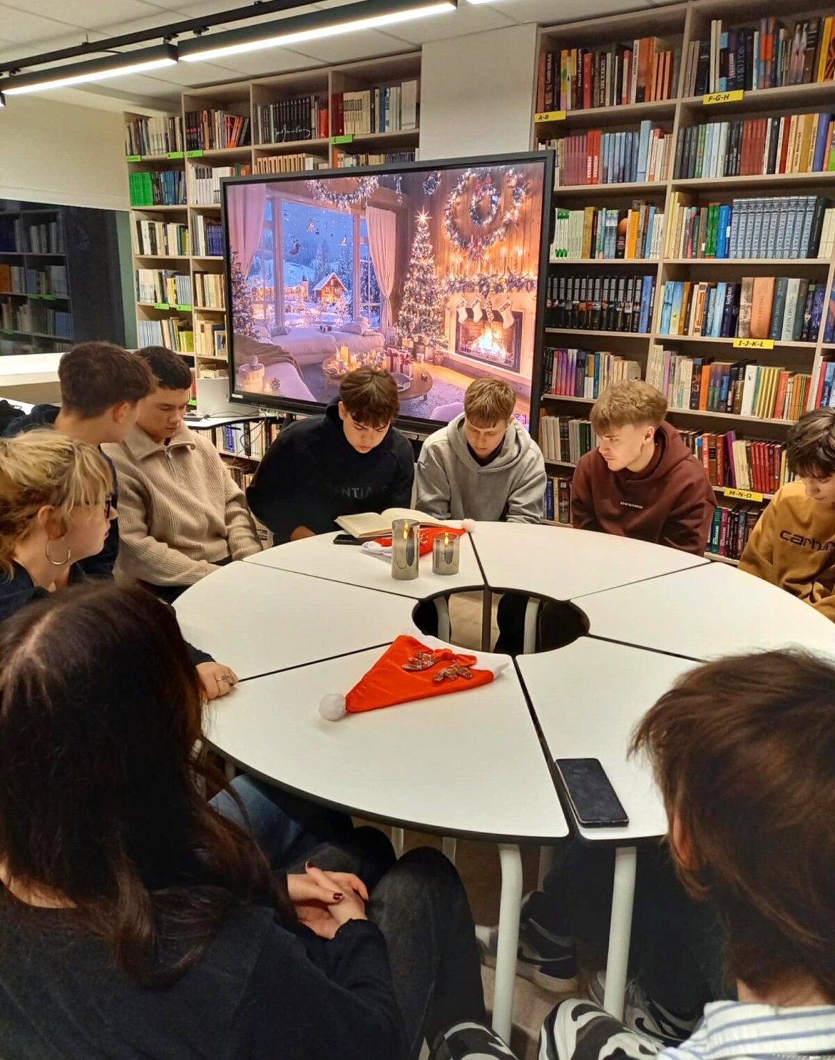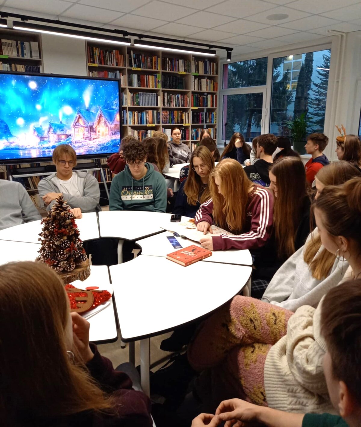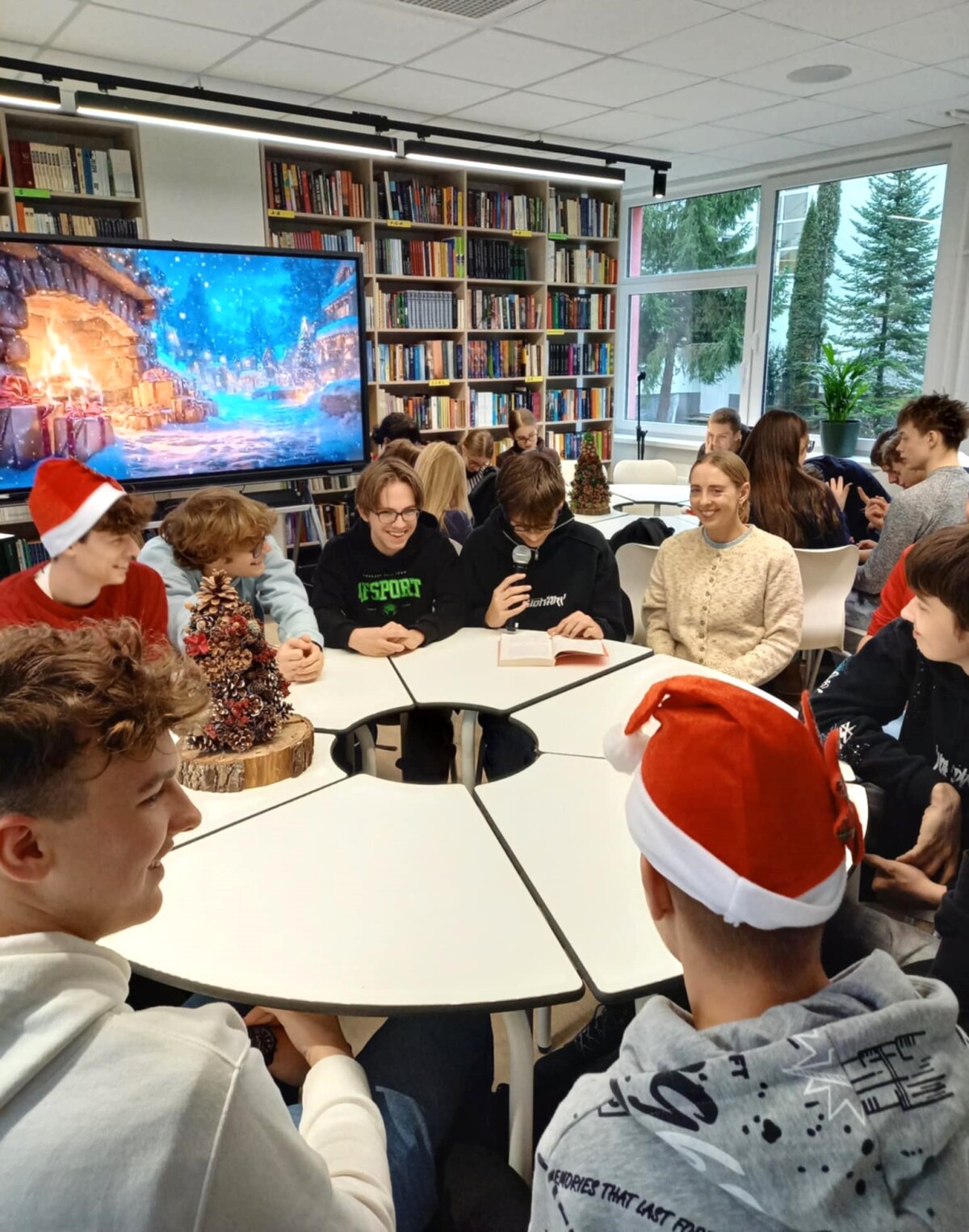 Artėjant gražiausioms metų šventėms knyga gali tapti jaukia ir praturtinančia advento laikotarpio tradicija. Ramybe ir šventine nuotaika dvelkiančioje gimnazijos skaitykloje skaitėme ir klausėmės jautrių, pamokančių, nuotaikingų kalėdinių pasakojimų.