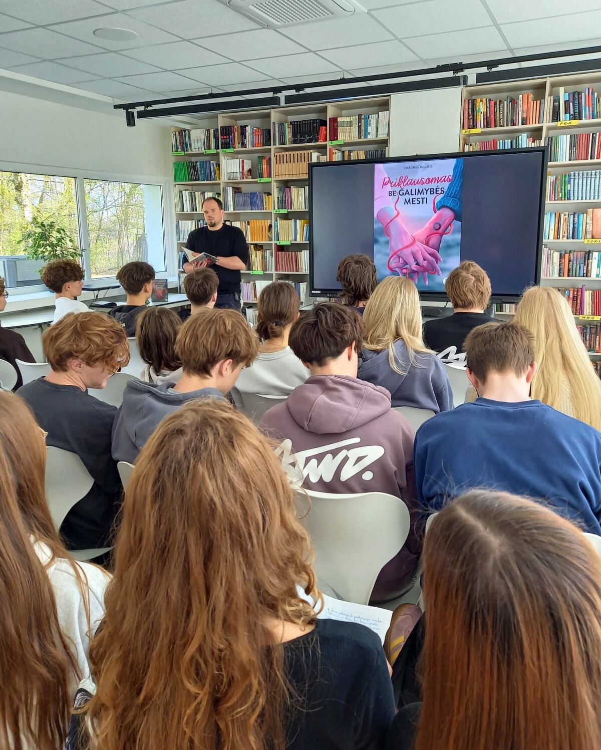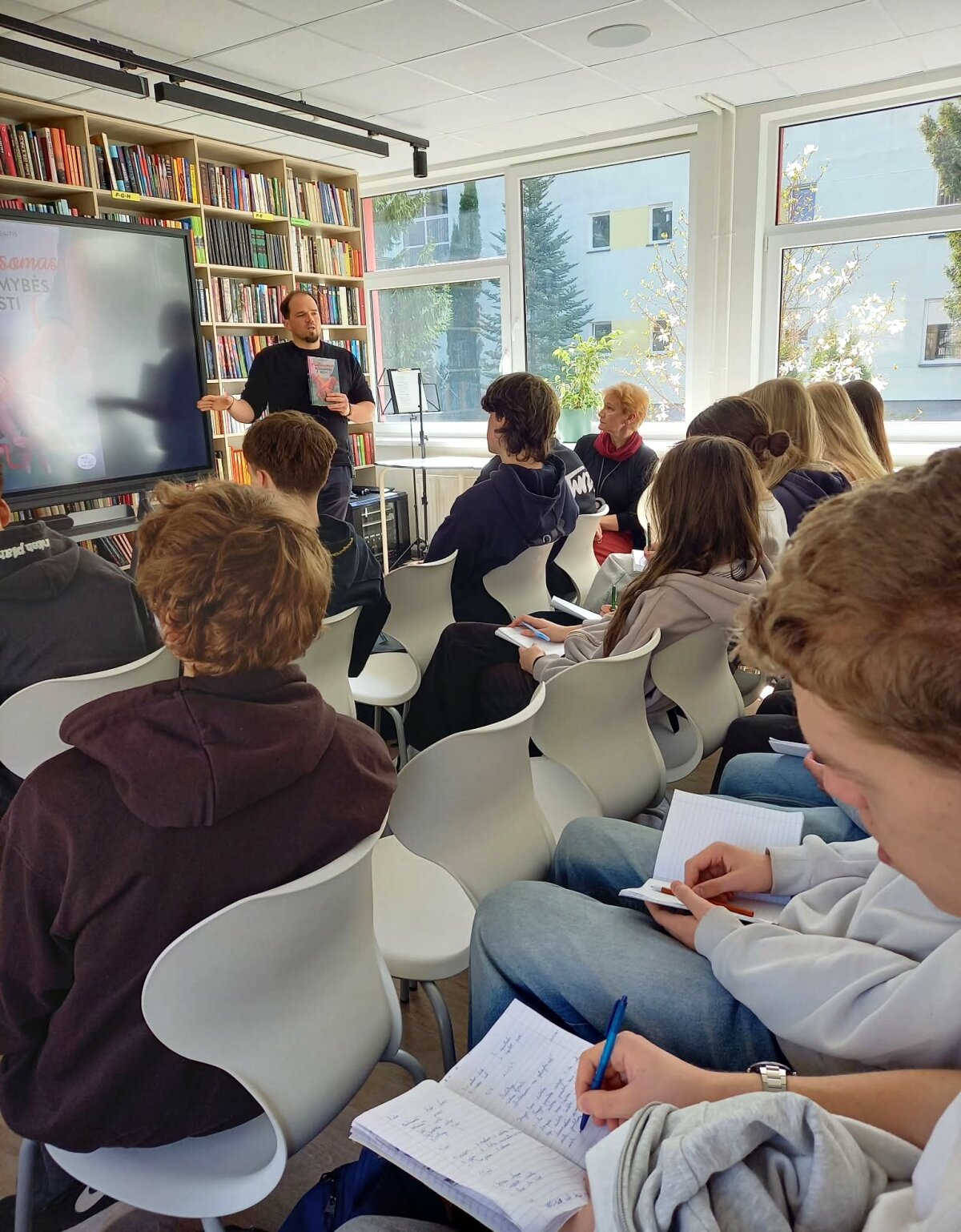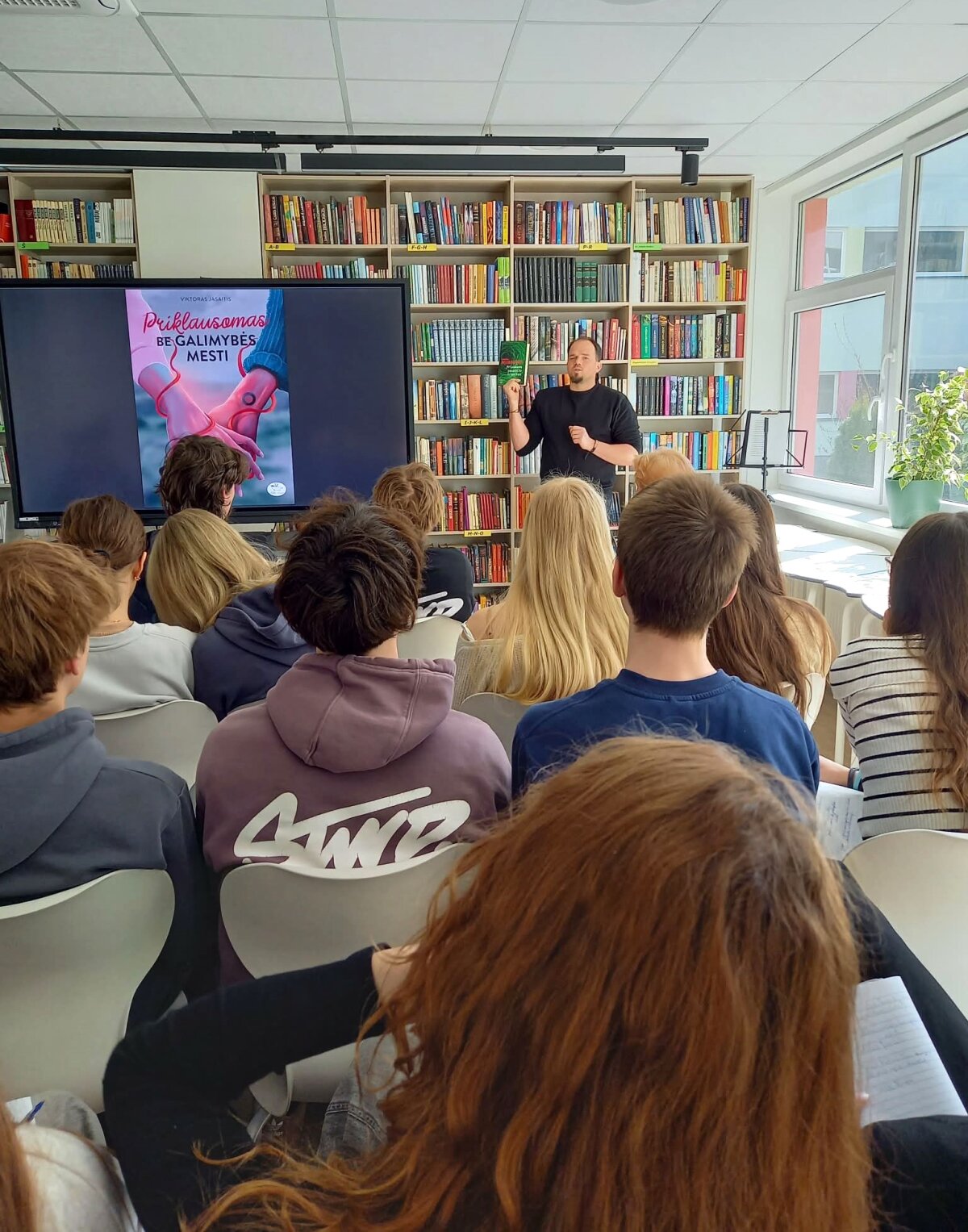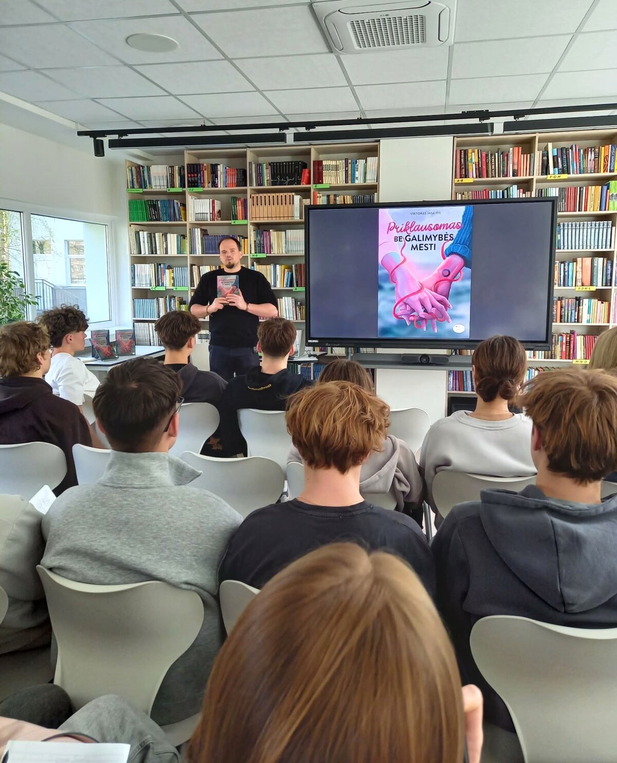 Balandžio 24 d. Radvilų gimnazijoje lankėsi rašytojas, publicistas Viktoras Jasaitis. Susitikimas paliko gana stiprų įspūdį, nes autorius pasirodė ne tik kūrybingas, bet ir labai nuoširdus, kalbėdamas apie savo patirtis bei įkvėpimą. Jis papasakojo apie savo debiutinę knygą ,,Priklausomas. Be galimybės mesti'', išleistą 2022 metais. Ji parašyta dienoraščio forma ir neturi dialogų. Tai suteikia galimybę artimiau susipažinti su pagrindiniu knygos veikėju – vienuoliktoku Mantu, kurio gyvenimą iš esmės pakeičia liga – pirmojo laipsnio cukrinis diabetas.
