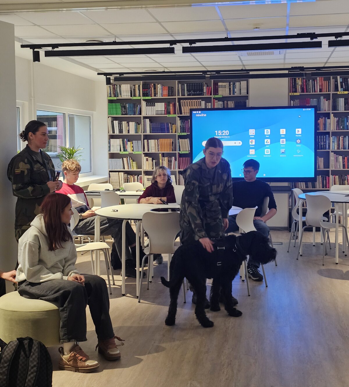 Renginyje dalyvavusios Lietuvos šaulių sąjungos šaulės Agnieta Giunter ir Aneta Volček papasakojo, kad savanorystė įmanoma net ir su savo augintiniais. Agnieta Giunter supažindino su savo augintine Hera ir papasakojo, kaip ji treniruojama žmonių paieškai. Mokiniai buvo aktyvūs ir smalsūs, todėl sulaukta tiek klausimų apie realias paieškos situacijas, tiek apie Heros svorį.